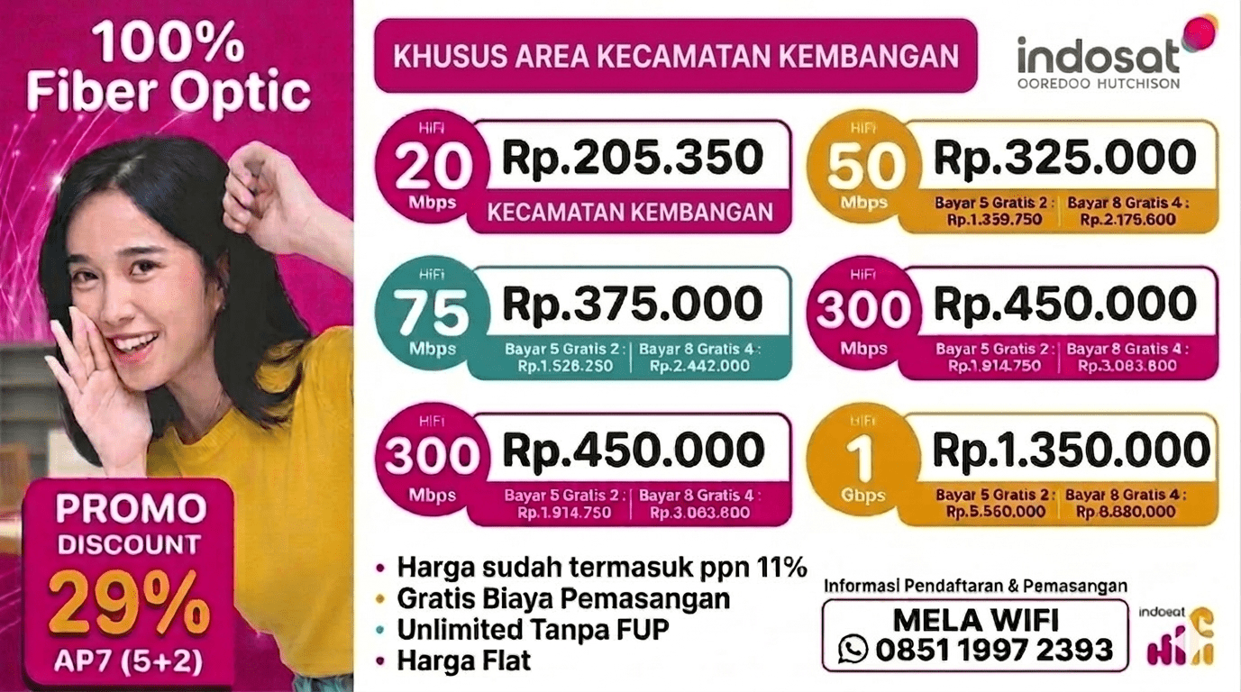 Bagi warga Kecamatan Kembangan yang membutuhkan koneksi internet stabil dan cepat, Indosat HiFi kini hadir dengan cakupan jaringan yang lebih luas. Menggunakan teknologi 100% Fiber Optic, kami memberikan jaminan kelancaran untuk bekerja dari rumah, belajar daring, hingga hiburan keluarga tanpa hambatan.